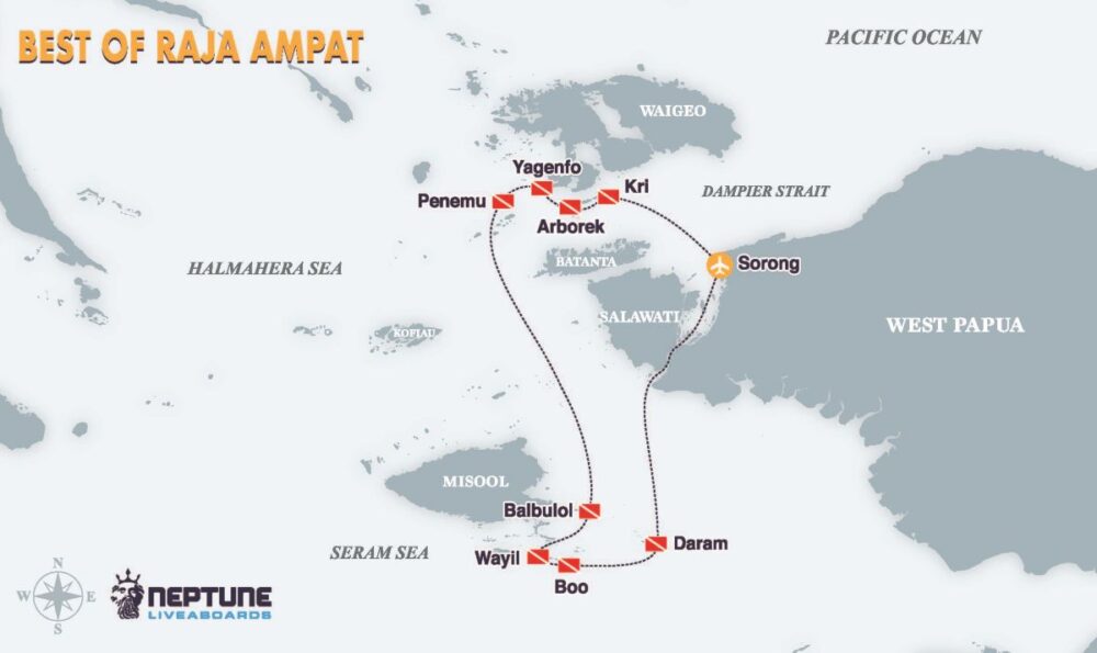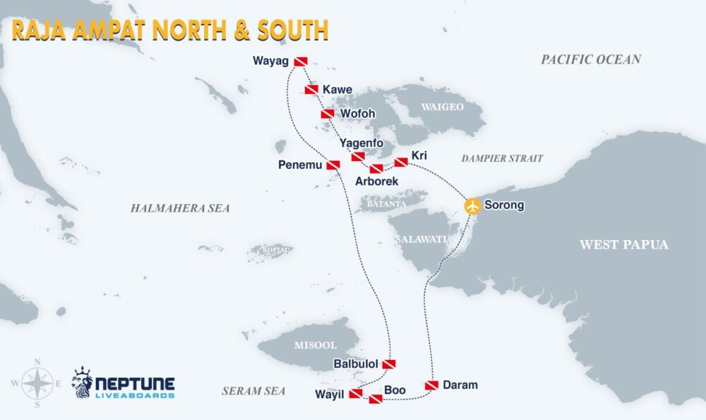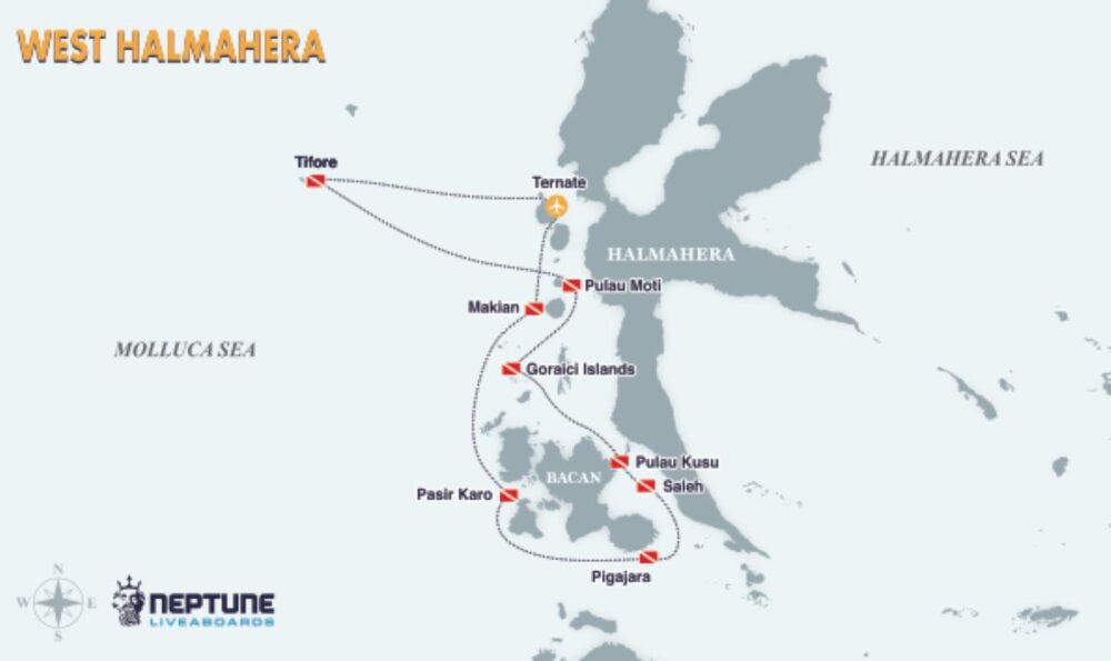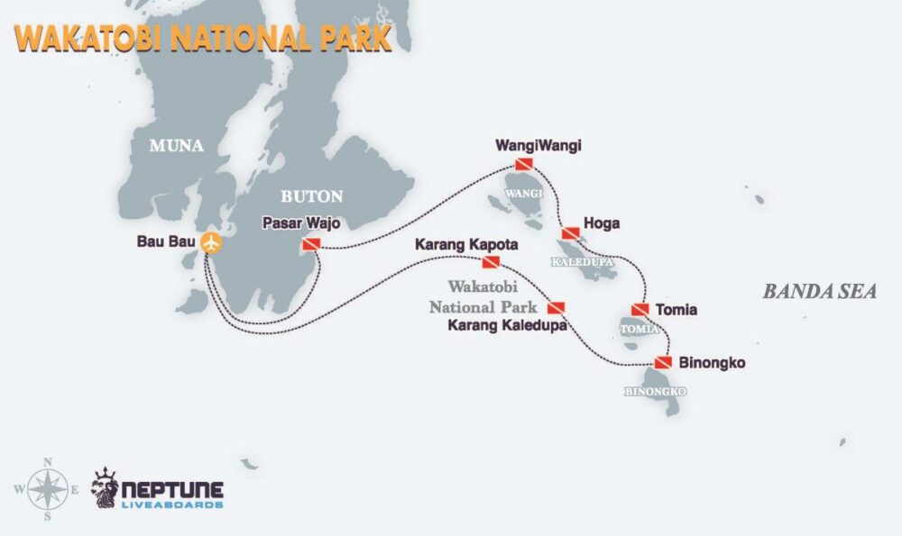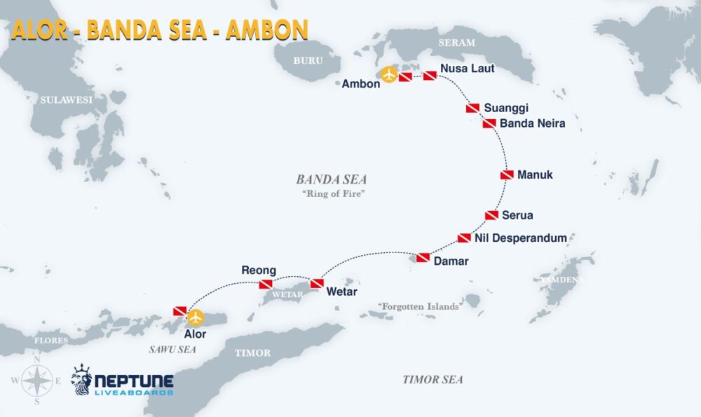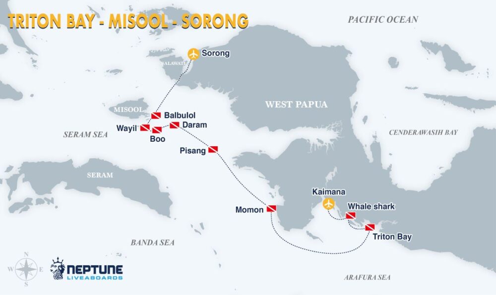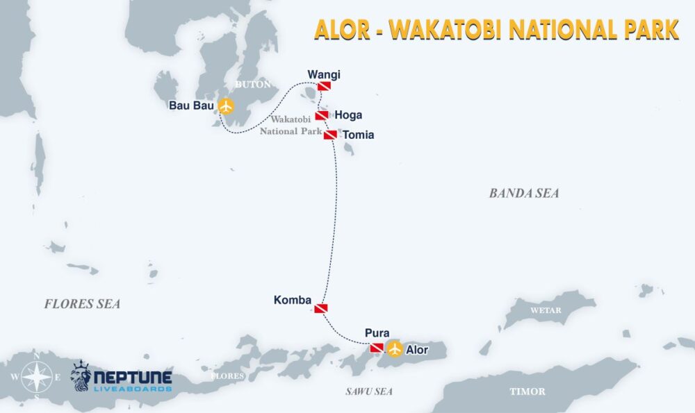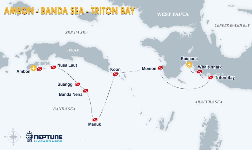 Neptune King dive cruises range from 08 to 10 nights on itinerant round trips visiting the best diving areas of: Wakatobi, Halmahera, Banda Sea, Raja Ampat, Triton Bay, Alor, Flores, the Banda Islands, and the Forgotten Islands.